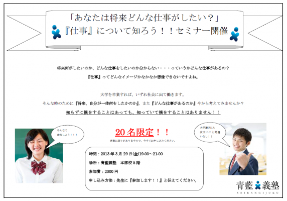 2013年3月29日(金)、青藍義塾 本部校にて、就活セミナーを実施致します。