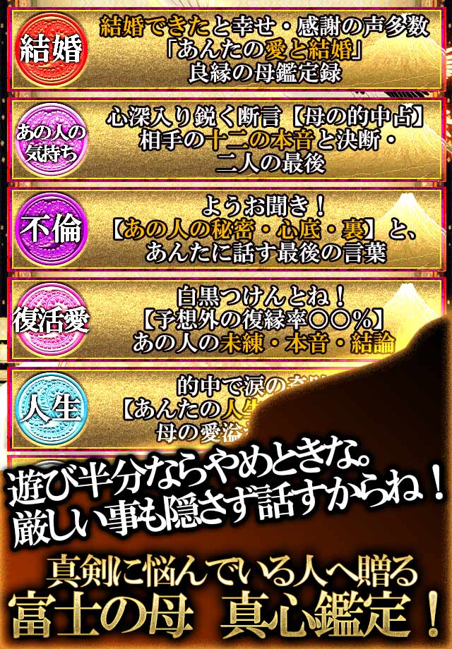本アプリは、まるで奇跡!もはや当たるを超えた奇跡として知られる「静岡富士の母」の占いアプリです。