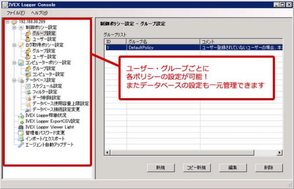 IMCP ver2.0では、管理コンソールが一新され、制御ポリシーやログの取得ポリシーなどの各ポリシー設定の他、データベースなどの各ツールの設定を統合管理できるようになりました。 また、グループ・ユーザ単位で制御ポリシーを詳細に設定でき、お客様の運用ポリシーに応じた柔軟な制御管理が可能になりました。