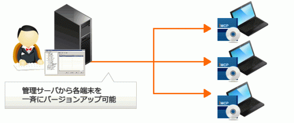 エージェント自動アップデート機能が追加されました。従来、ソフトウェアのアップデートはクライアント端末で行う必要がありましたが、IMCP ver2.0からは、管理サーバ上で各端末のアップデートを実施する事が可能となります。
