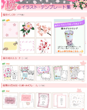 なお、これらのイラスト・テンプレートを掲載する「桜のイラスト・テンプレート集」コーナーでは、他にも桜のイラスト225点、写真87点のほか、桜のぬりえカード、桜柄グリーティングカードやPowerPoint背景デザイン、そして、お花見に今すぐ役立つ箸袋&ランチョンマットのテンプレートなど、合わせて500点以上のコンテンツを提供しています。