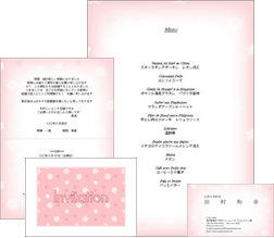 招待状には、サンプルとして結婚式招待状の文例、名刺にはパーソナル用名刺の項目、そして、A4フレームにはメニューが入っていますので、書き換えるだけで簡単に作成できます。