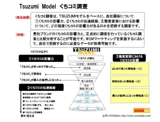 廣告社株式会社(本社 東京都中央区 銀座 社長 湯澤斎)が運営しているくちコミマーケティングの研究プロジェクトサイトのWOMlabo(ワムラボ)では【Tuzumi Model くちコミ調査パッケージ】を2013年3月20日に発表しました。この調査は効果的なWOMマーケティングを考える上で必要となるリサーチツールです。