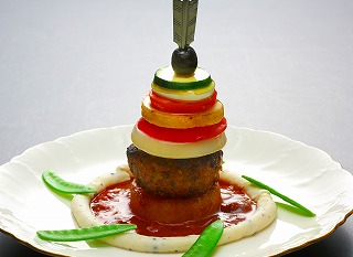 小豆島の家庭から食器など使わなくなった陶磁器を集め、「金継ぎ」という地元の修復技術を模した技法でつなぎ合わせた、岸本真之作「つぎつぎきんつぎ」をモチーフにしたハンバーグです。作品と同様に積み重ねられた、色鮮やかな食材たちにも注目してください。