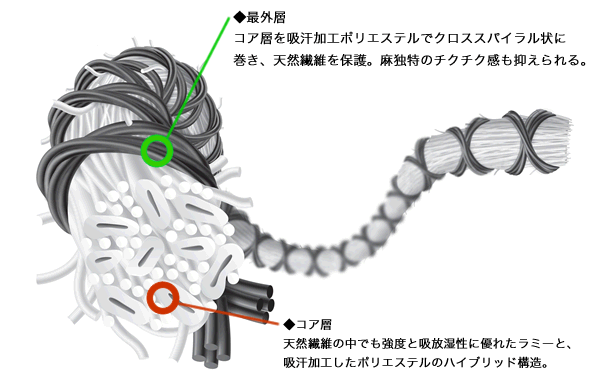 ラミーは麻の一種。通気性、速乾性に優れる麻とポリエステルを組み合わせて、吸放湿性と耐久性をアップ。同時に、麻独特のチクチク感も抑えられています。