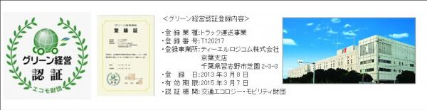 TLロジコム京葉支店は、安全確保としてGマーク(安全性優良事業所)認定※2を取得済であることから、グリーン経営認証とエコステージ認証と合わせ「安全と環境」に配慮した事業所として安全・安心で環境にやさしい物流サービスの提供を目指してまいります。