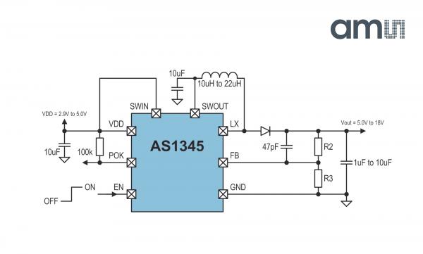 amsのAS1345は、コイル電流制限のピークを100mA、200mA、350mA、500mAの異なる4種類から選択でき、幅広い負荷に対し、効率を最適化します。AS1345の出力電圧は、12V、15V、17Vの固定電圧か、5~18Vの可変電圧から選択できます。全てのバリエーションは、共通のフットプリントおよびピン配置を採用しています。