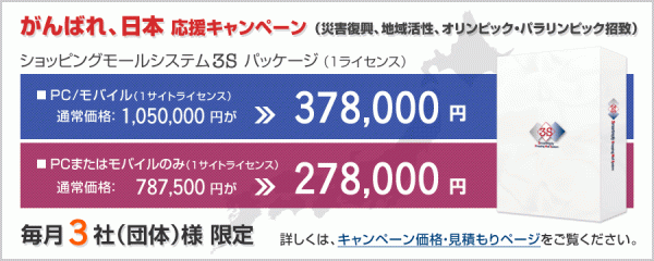 被災地や過疎化に悩む地域で求められている地域活性や町興し(まちおこし)では、継続した収益が求められます。同社は、商店街や専門的な商品を取り扱う複数の店舗がオンライショップを運営出来る仮想ショッピングモールを、インターネット上に構築する3S(スリーエス)スマートリプライショッピングモールシステムを開発・販売しており、地域が継続して収益を確保するツールとして、毎月限定3社にライセンス価格を半額以下にした特別価格で提供を始めます。