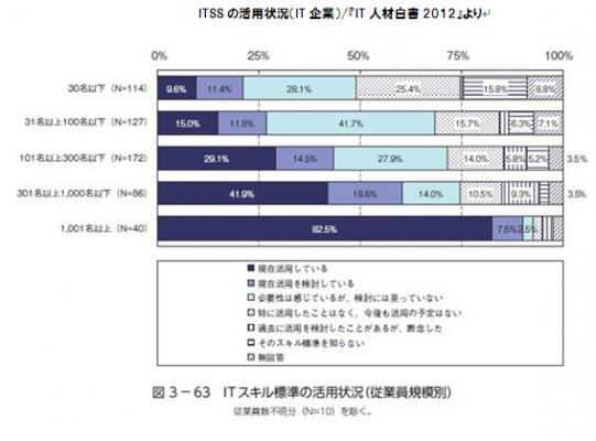 独立行政法人 情報処理推進機構(IPA)の発行する『IT人材白書2012』によると、大手IT企業では活用が進んでいる「ITスキル標準」が、中堅・中小企業では未だ活用が進んでいない現状が報告されています。