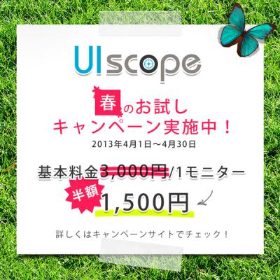 株式会社InnoBeta(本社 東京都渋谷区、代表取締役 平石 大祐)が運営する、スマホユーザーテストのUIscope(http://uiscope.com/)でユーザーテスト基本料金3,000円が半額の1,500円になる「春のお試しキャンペーン」(http://uiscope.com/spring2013/)を実施致します。