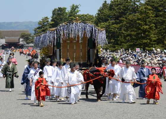 薫風の五月を迎えると、京の町は“京都の三大祭”のひとつ“葵祭の季節”の到来です。祭りは、下鴨神社と上賀茂神社の例祭で、「葵祭」の名で知られますが、正式名称は賀茂祭。日本三勅祭(賀茂祭、石清水祭、春日祭)のひとつで、神前に葵を献じ、参列する人や車、社殿や家々を葵の葉で飾ります。中世で「まつり」といえば、賀茂祭をさしました。祭りは平安王朝時代の古式のままに「路頭の儀(行列巡行)」「社頭の儀」が執り行われ、内裏宸殿の御簾をはじめ、御所車、勅使、供奉者の衣冠、牛馬にいたるまで、全てが葵の葉で飾られています。上賀茂神社、下鴨神社では、5月に入ると祭の前儀が数々催されます。「路頭の儀」の行列は、15日午前10時30分京都御所を出発、総勢500名以上の風雅な行列が下鴨神社を経て、上賀茂神社へ向かいます。葵祭行列の見学には、京都御苑と下鴨神社参道に設けられる有料観覧席のご利用をおすすめします。