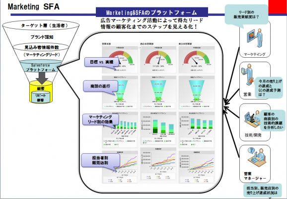 ■Marketing&SAFは従来分離していた、マーケティングリードと営業活動を効率的に統合。これによりマスメディアによる顧客情報(リード)の取得からSalesforceによる顧客マネジメントまで一貫した戦略の実施が可能になります。さらにSalesforceによる膨大な入力情報を分析することにより業務も改善します。
