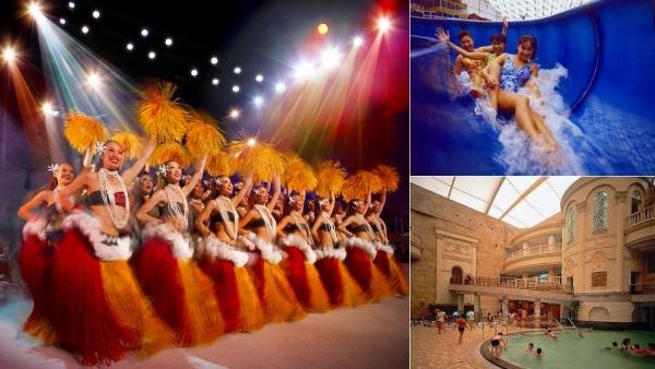 毎分3トン湧出する新鮮な温泉を使い、5つの温泉テーマパークで構成されるハワイアンズ。1年中28度に保たれた常夏ドームや、フラガールのポリネシアンショー、そしてギネスワールドレコーズにも認定された世界最大の大露天風呂など、楽しみ方は自由自在。