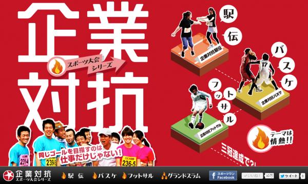 企業対抗スポーツ大会シリーズは、2013年5月18日に開催する「第4回企業対抗駅伝in東京」をはじめ、6,7月に開催する「第1回企業対抗バスケ」、9~11月に開催する「第1回企業対抗フットサル」の3種目になります。