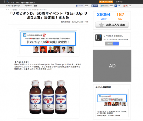 株式会社U-NOTE(本社:東京都杉並区、代表取締役CEO:小出悠人)は、同社が運営するイベントまとめプラットフォーム「U-NOTE」(http://u-note.me)においてイベント主催者向けの「公式イベントまとめ」の提供を開始しました。また第一弾として、「大正製薬presents『リポビタンD』50周年イベント『StartUp リポD大賞』決定戦!~リポD兄貴が選ぶ、応援したいStartUp支援プロジェクト~」の広告掲載を予定しております。