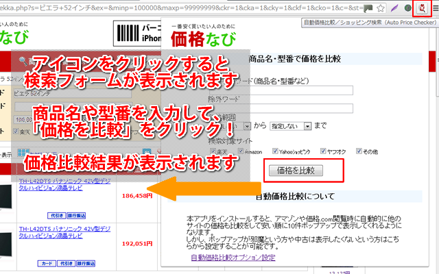 主要ショッピングサイト、価格比較サイトの商品ページにアクセスするだけで自動的に他のショッピングサイトの価格を比較して表示してくれます。