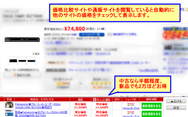 主要ショッピングサイト、価格比較サイトの商品ページにアクセスするだけで自動的に他のショッピングサイトの価格を比較して表示してくれます。