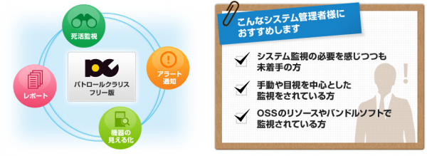 この度、ご提供致します「パトロールクラリス フリー」は、機械設備、汎用機の管理端末、サーバー、ネットワーク機 器、モバイルデバイスにお役立て頂ける死活監視機能を軸に、ご好評を頂いております日本語ウェブインターフェースによる高機能なレポート機能、障害情報を 集約するビュアーなど、パトロールクラリスの基本機能を完全無料にて提供し、企業、教育機関、サービス提供者様へご導入頂ける事を期待しております。
