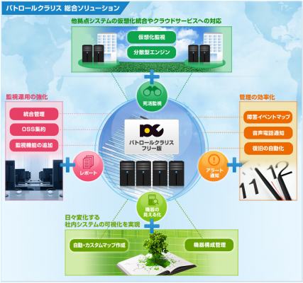この度、ご提供致します「パトロールクラリス フリー」は、機械設備、汎用機の管理端末、サーバー、ネットワーク機 器、モバイルデバイスにお役立て頂ける死活監視機能を軸に、ご好評を頂いております日本語ウェブインターフェースによる高機能なレポート機能、障害情報を 集約するビュアーなど、パトロールクラリスの基本機能を完全無料にて提供し、企業、教育機関、サービス提供者様へご導入頂ける事を期待しております。