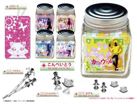 こんぺいとうは、作品に登場するキャラクターをイメージした3色を組み合わせ、小さなガラス瓶に詰めた商品。カラフルな星形のお菓子が「カーニヴァル」の作品世界にぴったり合っています。