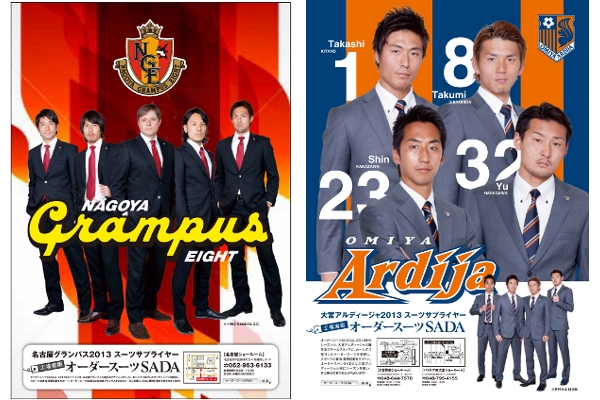 より、サッカーのJ1の3チーム(柏レイソル、名古屋グランパスエイト、大宮アルディージャ)、J2の5チーム(横浜FC、東京ヴェルディ、アビスパ福岡、ギラヴァンツ北九州、Vファーレン長崎)の2013年シーズン用オフィシャルオーダースーツの販売を開始します。