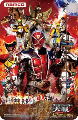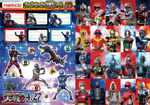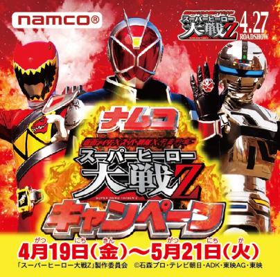 株式会社ナムコ(本社:東京都大田区)は、映画「仮面ライダー×スーパー戦隊×宇宙刑事 スーパーヒーロー大戦Z」(4月27日全国公開)とのタイアップキャンペーン「ナムコ スーパーヒーロー大戦Z キャンペーン」を2013年4月19日(金)から5月21日(火)まで、全国のナムコ直営アミューズメント施設約180店舗で実施します。