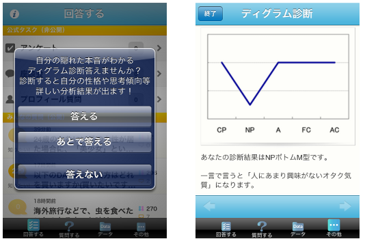 「ディグラム診断」では、アンケート調査で取得した(※2)6万人。述べ 1000 項目を超えるデータベースに基づいて、被験者に心理テスト結果と調査から得られたライフスタイルや恋愛傾向等の情報を、統計処理を施し客観的にフィードバックします。