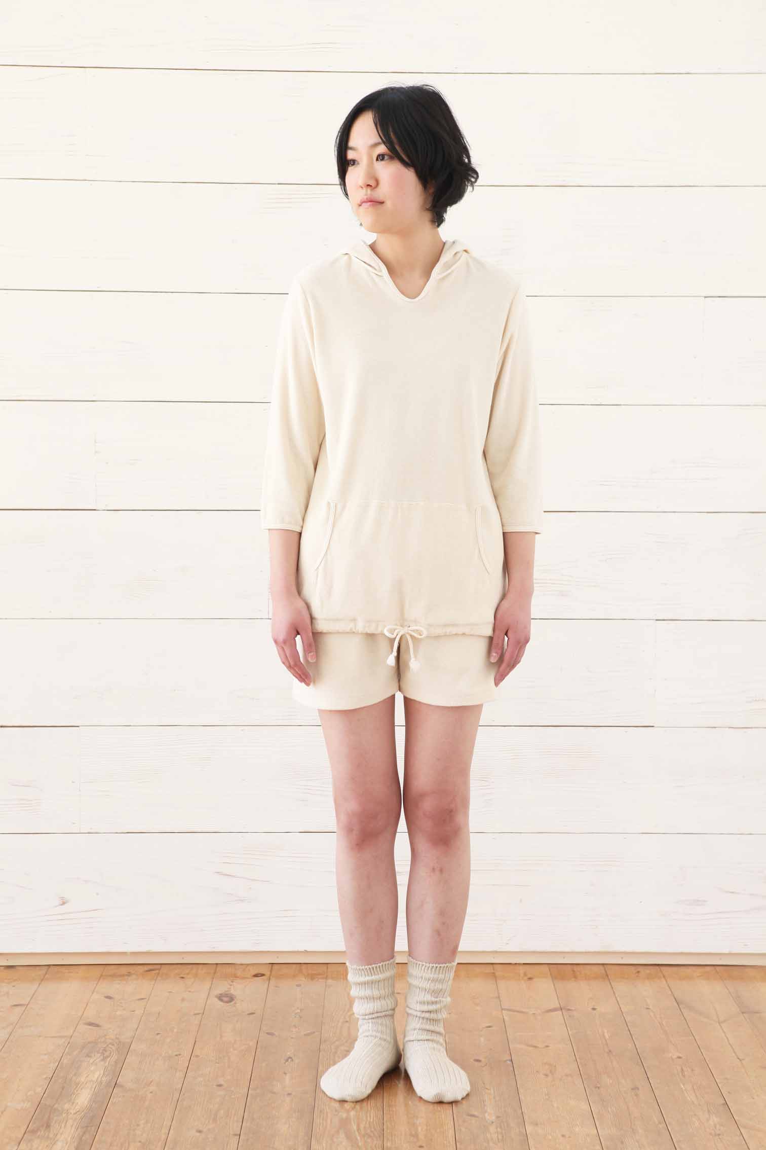 インド産の高品質な超長繊維糸を緻密なループ状に織り上げたニットパイル生地でつくった七分袖パイルパーカーとショートパンツ。スポーツウェアとして動きやすさや吸放湿性を重視したほか、細やかなディテールまでデザインしファッションアイテムとしても活躍します。