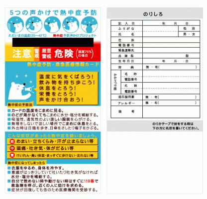「熱中症予防・救急医療情報カード」と「熱中症予防カードポストカードタイプ」は実用新案登録商品です。