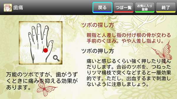 つぼアプリは、販売実績"20万本"のロングセラーアプリです。歯痛、二日酔い、食べ過ぎ、肩こり、頭痛、目の疲れ、ストレス、美肌、便秘など数多くの人体の「つぼ」を探すことができます。ダイエット、安眠、冷え性などのタイマー付きの便利な刺激コースのメニューもあります。