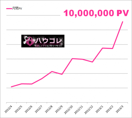 2009年12月に公開したハウコレは、サイト構成の改善、大手メディアとの提携、ライターの拡充(現在20名超)、モデルの起用などの施策によって、順調な成長を遂げており、直近1年間でのPVの成長率は500%を超えております。広告収益の増大により、2013年3月は単月黒字化を達成しました。