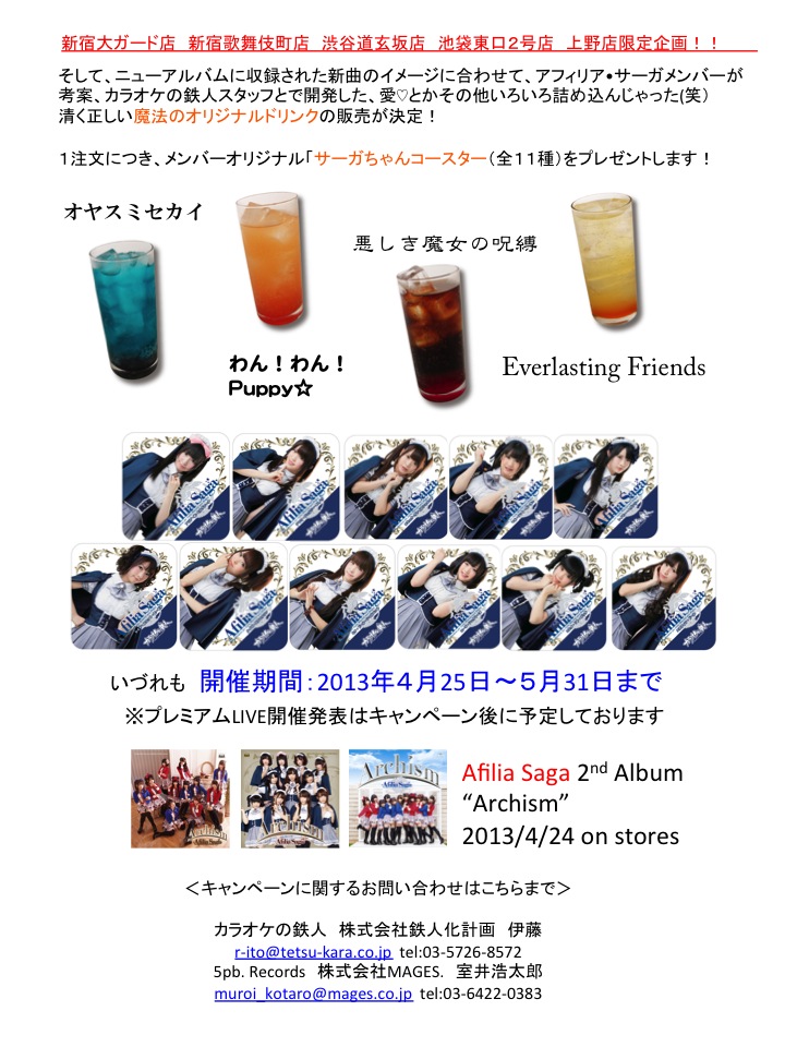 カラオケの鉄人スタッフと共に開発した、愛とかその他いろいろ詰め込んじゃった(笑)清く正しい魔法のオリジナルドリンクの販売が決定!1注文につき、メンバーオリジナル「サーガちゃんコースター(全11種)をプレゼントします!