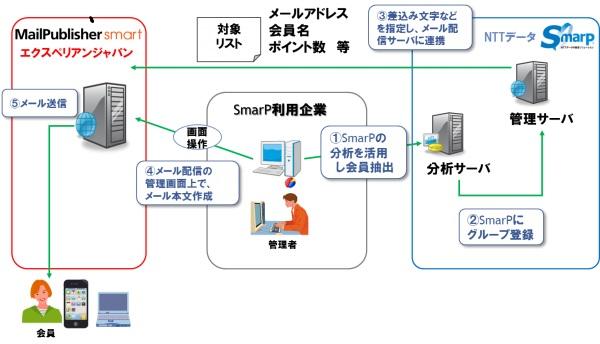 決済と連動したポイント・キャンペーン管理を行うNTTデータのクラウド型販促支援ソリューション「SmarP」は、購買状況やポイント情報から顧客動向を分析できる機能により、戦略的な販促方法を提案します。従来、メールによる販促活動は別のシステムを用いて実行する必要がありましたが、今回 MailPublisher Smart が連携することで、販促活動からその結果の反映までを一連の操作で出来るようになります。特に、利用状況に応じた店舗限定メールやポイント・キャンペーンと連動した販促メールなど、SmarP の顧客分析結果に基づいた複雑なターゲティングメールを簡単に設定可能です。同時に、リアル店舗やO2Oビジネスにおいて重要なスマートフォン向け施策も、MailPublisher Smart のスマートフォンに最適化した配信機能を用いることで、効果的に実施することが可能となっています。