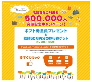 ブランディアでは、累計利用者数50万人突破を記念して、ギフト券全員プレゼント&総額50万円分の旅行券の当たるキャンペーンの実施を予定しております。