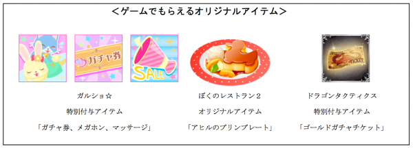 本サービスの公開を記念して対象ゲームの利用者全員に、ここでしか手に入れることのできないオリジナルアイテムや、ゲームを有利に進められる消費アイテムなどをプレゼントします。
