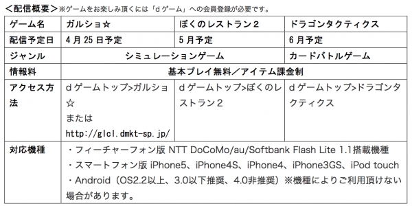 株式会社enish(本社:東京都渋谷区、代表取締役社長:杉山全功、以下「enish」)は、株式会社エヌ・ティ・ティ・ドコモ(本社:東京都千代田区、代表取締役社長:加藤薰、以下NTTドコモ)が運営するゲームプラットフォーム「dゲーム(TM)」において人気のソーシャルゲームアプリ「ガルショ☆」、「ぼくのレストラン2」、「ドラゴンタクティクス」の計3サービスの配信を4月25日より随時開始いたします。