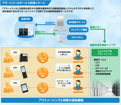 株式会社コムスクエア(東京都中央区、代表取締役社長:上嶌 靖 以下コムスクエア)は、システム障害通知や運用時のエスカレーションの効率化などセルフマネジメントを支援する自動音声による電話通知サービス「パトロールクラリス アラートコール(PATROLCLARICE Alert Call)」を2013年6月より提供開始致します。