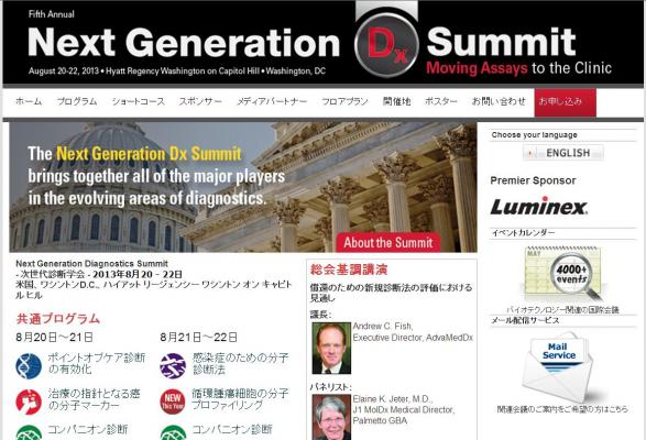 Next Generation Dx Summit(ポイントオブケア診断の有効化、治療の指針となる癌の分子マーカー、感染症のための分子診断法、コンパニオン診断、分子診断法の商品化、循環腫瘍細胞の分子プロファイリング)は、変化する診断分野におけるすべての主要な関係者の方々に集まっていただくために企画されました。今年は、産業界、政府、主要な学術機関から素晴らしい講演者の方々をお迎えしました。当会議では臨床への応用と商品化に焦点を当てた技術研究開発の進歩を披露します。業界リーダーが将来の市場機会について何を語るのかに耳を傾け、同業者との交流を深める場として、8月20~22日の日程でワシントンDCにて開かれるこの会議にぜひご参加ください。