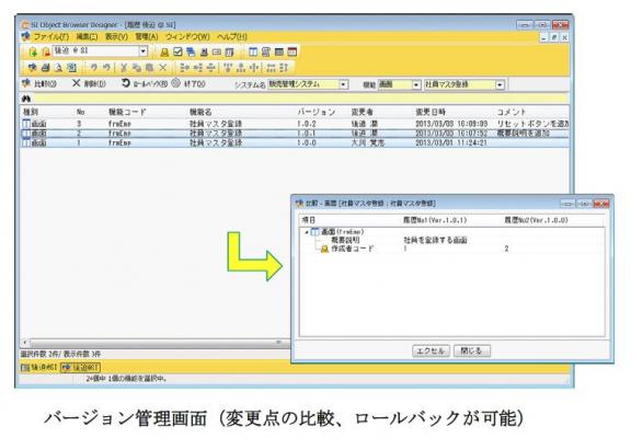 設計書の記述に間違いが多いほど、下流工程からの後戻りによるオーバーヘッドが高くなるため、設計書の品質は非常に重要です。OBDZでは、設計データの変更内容は自動で記録され、変更バージョンごとの比較も可能ですので「誰が、いつ、何を変更したのか」をいつでも確認できます。定期的に他の設計書と誤って修正されていないか、変更内容に間違いがないかなどを確認にすることにより設計書品質の向上に役立てることができます。また、更新日付などの情報も自動で記録されますので、更新日の変更忘れなどのありがちなミスも防止できます。