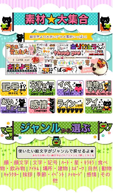 そんな盛りだくさんの素材をジャンル別やキーワードで探せるから、必要な時にすぐに使えるおもしろくてかわいいデコメ絵文字が月額315円で取り放題のサイトです。