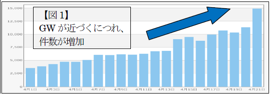 「ゴールデンウィーク」、「GW」を含むツイッターの投稿件数の推移をグラフにしたところ、【図1】のようになりました。ゴールデンウィークが近づくにつれて、投稿件数が多くなっているのが分かります。