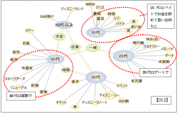 GWの「行き先・遊び先」として「ディズニー」と記された投稿を抽出し、内容を年代別に分析したところ、【図2】のようになりました。