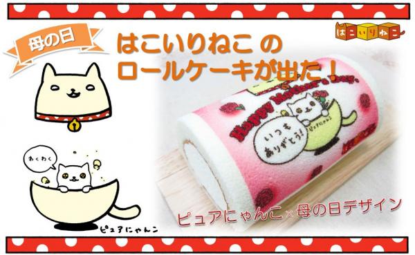 「はこいりねこ」のキャラクターの一つである「ピュアにゃんこ」のデザインがプリントされたロールケーキで、母の日限定のデザインです。