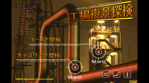 工場夜景の写真を種類/タイプごとに分けたモードです。コースを複数選択してスライドショーを開始。