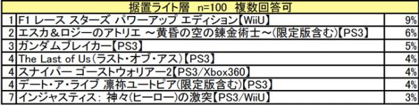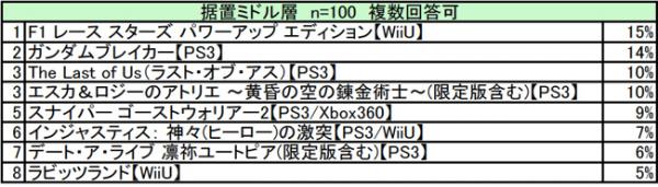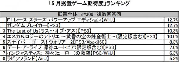 ユーザーがオススメする6月発売の据置ゲームトップ3は、1位「F1 レース スターズ パワーアップ エディション」、「ガンダムブレイカー」の2作品が同率で、3位「The Last of Us」となりました。