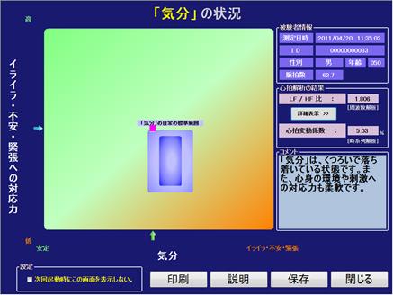 アルテットCDNを発売し、自律神経機能評価のソフト「気分の状況」画面ができました。自律神経のコントロールが上手く行かない場合には、体温調節に支障をきたすことがあります。2分(もしくは100拍)の測定後、自動で「気分の状況」画面を出すことができます。 安静にして測定していただく前提ですが、18歳以上80歳未満の「気分の日常の標準範囲」が 表示されます。自律神経の標準評価は、学術的にいまだ確立されておりませんので、参考値です。従来のアルテット(WinXpバージョン)の周波数解析範囲で測定されたものです。アルテット・CDNは医療用具の認可を受けた研究者向けの商品であり今後アルテット等で、多くの研究者により熱中症にかかりやすい人の早期発見ができる商品の開発に期待されています。アルテット・CDNの詳細については弊社にお問い合わせ下さい。センサやソフトの内容等弊社でお答えできないときは 開発メーカーを紹介させて頂きます。