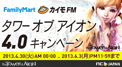 PC向けオンラインゲーム『The Tower of AION(以下、タワー オブ アイオン)』をサービス、運営するエヌ・シー・ジャパン株式会社(東京都渋谷区、代表取締役:金 澤憲(キム テクホン))は、株式会社ファミリーマート(東京都豊島区、社長執行役員:中山 勇)、株式会社ファミマ・ドット・コム(東京都豊島区、代表取締役社長:市川 透)の協力を得て、2013年4月30日(火)午前0時00分から2013年6月3日(月)午後11時59分までの間、「カイモFM タワー オブ アイオン 4.0」キャンペーン(以下、本キャンペーン)を全国のファミリーマート店舗約9,500店で実施いたします。