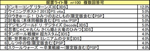 第1位の「ドンキーコング リターンズ3D」は2010年にWiiで発売された同作に追加マップや、バランス調整を行って3DSに移植した作品となっています。1980年代から続く任天堂の人気シリーズということもあり、ヘビー・ミドル・ライト全ての層で1位となりました。