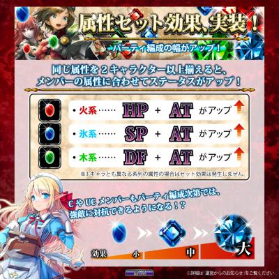 各キャラクターが固有で持つ属性は、これまで、戦闘における敵との相性にのみ影響を与えていましたが、今回、パーティ編成時にキャラクターの属性を揃えることで、味方へも影響を及ぼせるようになりました。これが「属性セット効果」です。