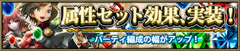 各キャラクターが固有で持つ属性は、これまで、戦闘における敵との相性にのみ影響を与えていましたが、今回、パーティ編成時にキャラクターの属性を揃えることで、味方へも影響を及ぼせるようになりました。これが「属性セット効果」です。